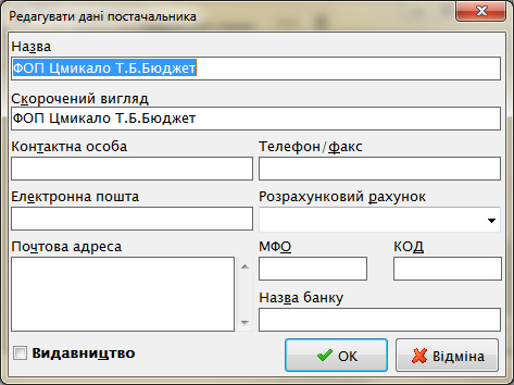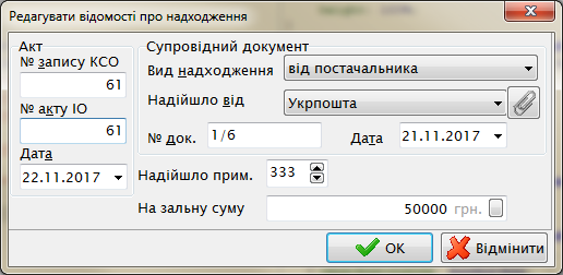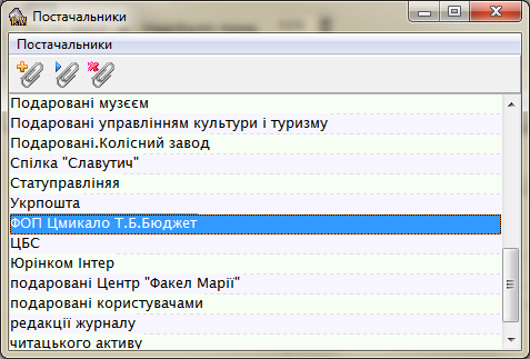 Заголовок акта поступлений содержит три блока информации: номер, дата акта; дополнительная информация о сопроводительных документах и суммарная информация. Номер акта это текущий номер в КСО 1. Суммарная информация не является обязательной, но помогает контролировать ввод позиций акта поступлений. В блоке дополнительной информации необходимо указать вид поступления (от поставщика, как замена по утрате читателем, в дар от, по обмену с, по подписке, как обязательный экземпляр, по переинвентаризации). В случае известного источника поступления необходимо указать этот источник в поле «Надійшло від». Справа от этого поля находится кнопка со «скрепкой» для управления поставщиками. На форме поставщиков с помощью кнопок управления можно добавить нового, редактировать или удалить одного из поставщиков.