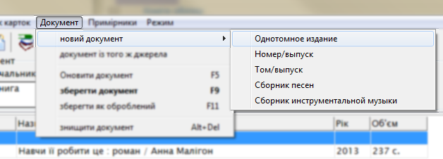 Для начала работы по заполнению акта необходимо создать новую позицию акта. Это можно сделать в основном меню окна «Документ – Новий документ» и выбрать нужный вид издания. Или с помощью кнопок быстрого доступа к созданию документов в последней секции кнопок.