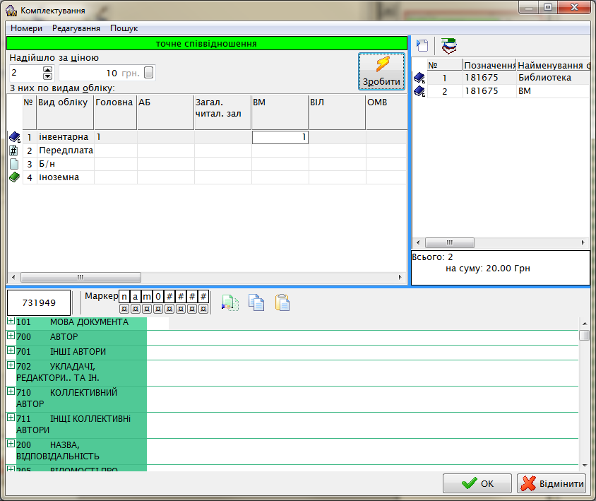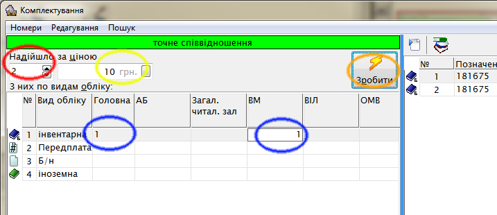 Если поступили экземпляры одинакового издания, но по разной цене, то здесь есть два варианта решения. Первый. Вы вводите количество экземпляров по одной цене с распределение по отделам и видам учета и жмете «Зробити». После добавляете количество по другой цене, корректируете цену, добавляете распределение и жмете опять «Зробити». Система добавит по новой цене введенную разницу. Второй способ. Вы вводите все по одной цене и жмете «Зробити». А уже в списке сделанных экземпляров проводите коррекцию цены в нужных позициях.